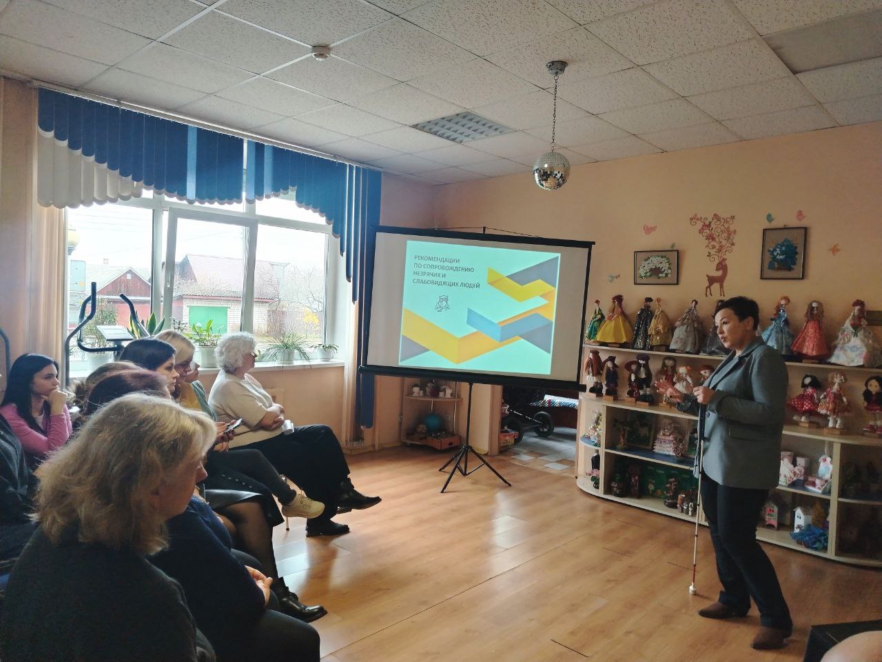 В рамках месячника «Человек с белой тростью» представители ГОО ОО «БелТИЗ» провели обучающее мероприятие для специалистов учреждения "Центр социального обслуживания населения Новобелицкого района г.Гомеля" посвящённое вопросам этики общения и особенностям сопровождения людей с нарушениями зрения.